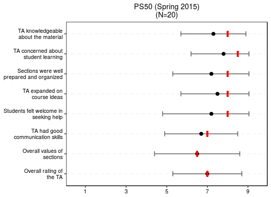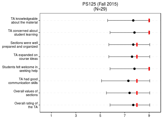 At UCLA, I served as Lead Instructor (rank: Teaching Fellow) in the 2016 Summer Session and as a Teaching Assistant (at the ranks of Teaching Assistant, Associate, and Fellow) in twelve courses from Fall 2012 to Spring 2016. Evaluations are available for courses taught at UCLA. (For courses taught more than once, I post the most recent evaluations.) Plots below report the median (red mark), the mean (black dot), and one standard deviation from the mean (grey range bar) of students’ evaluations for each item in the course evaluation form.
